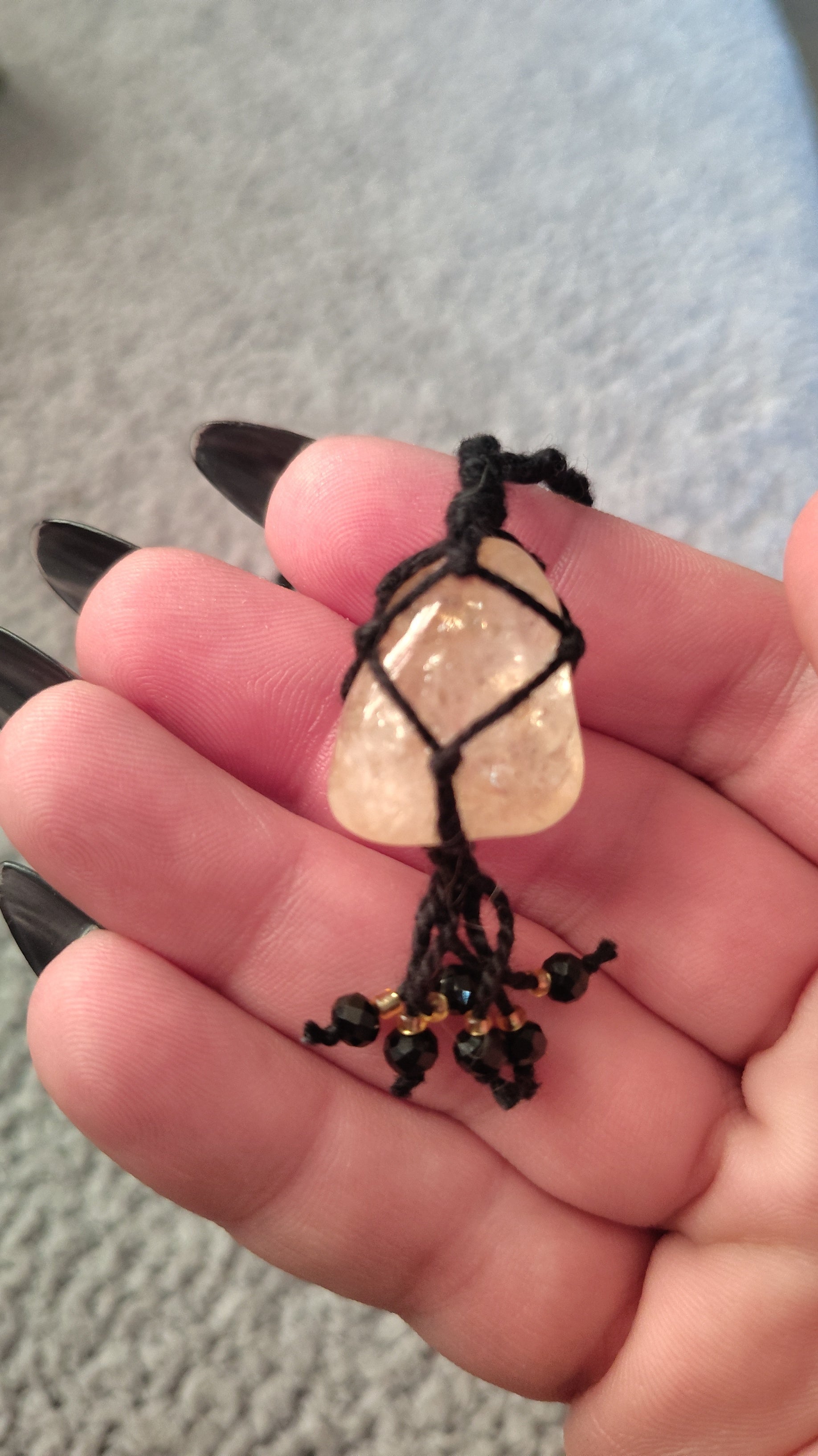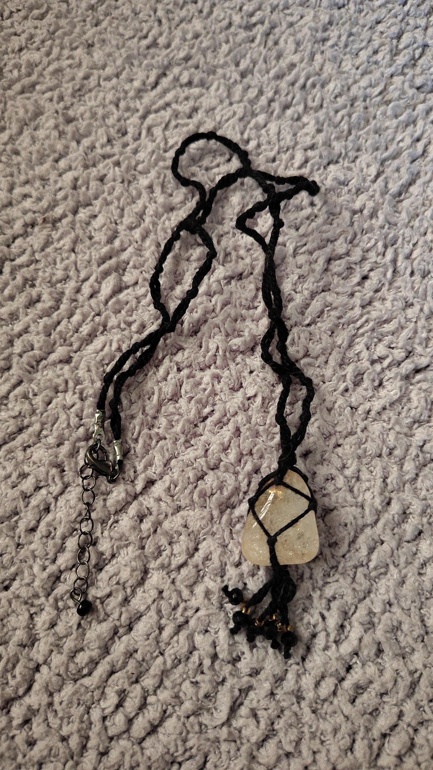 This necklace is hand tied macrame with black cord around a tumbled citrine piece with gold and black glass beads as a tassel. The necklace is adjustable from 20 to 22 in.