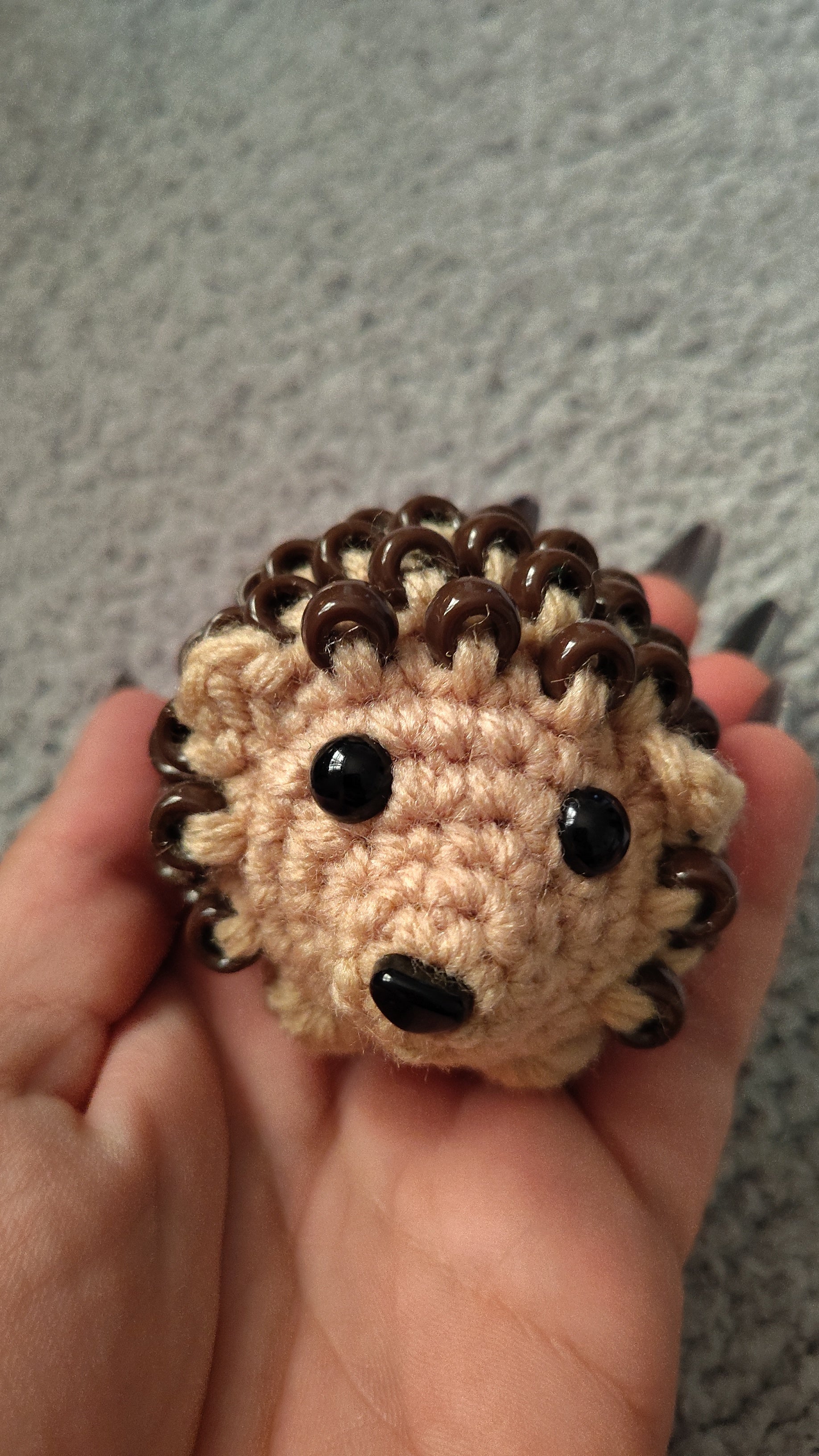 This listing is for one crocheted fidget hedgehog. You are buying one hedgehog, tan and brown colored, 3-in plush with acrylic pony beads. Machine washable, dry cold.