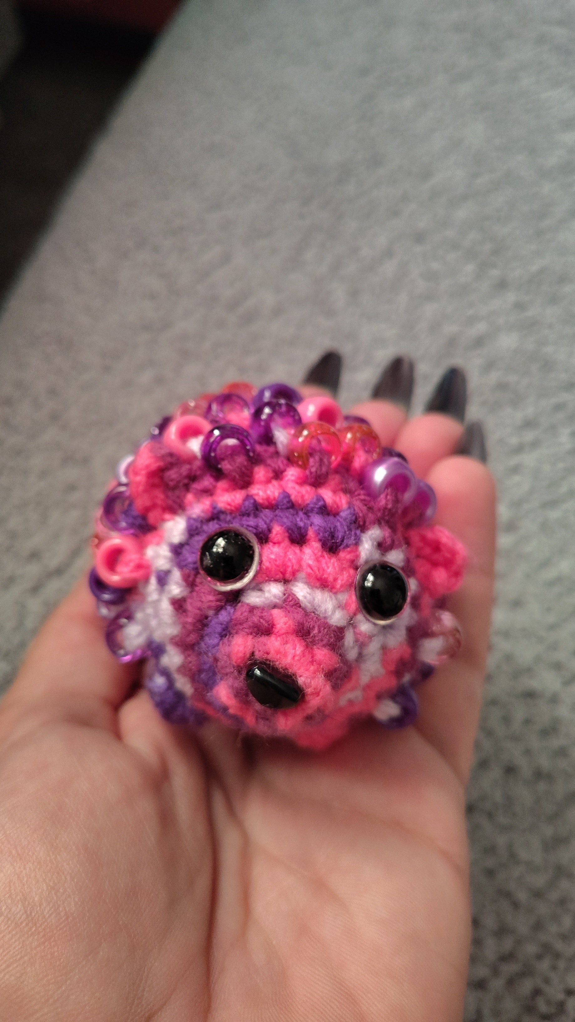 This listing is for one crocheted fidget hedgehog. You are buying one hedgehog, pink and purple colored, 3-in plush with acrylic pony beads. Machine washable, dry cold.