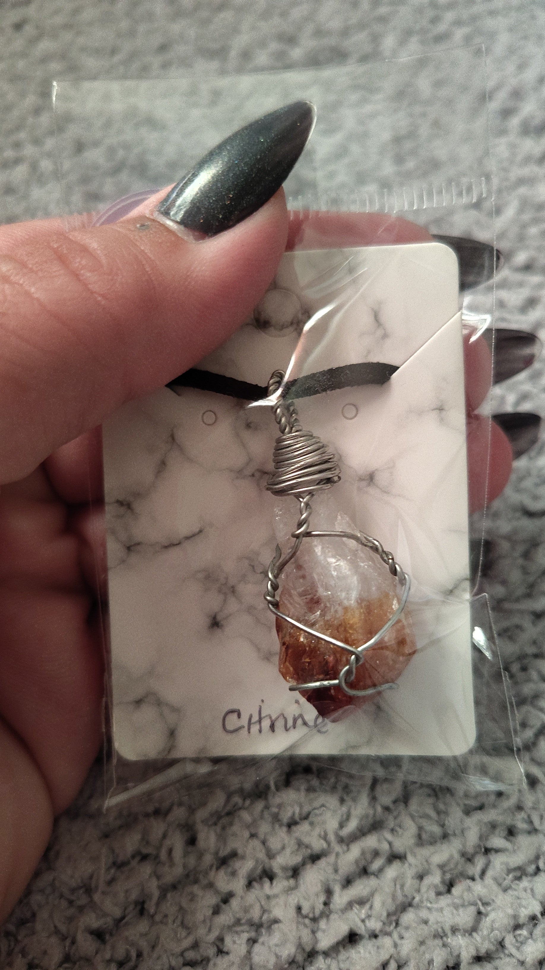 This necklace is a hand wire-wrapped raw heat-treated citrine piece on a 20 in sueded cord.